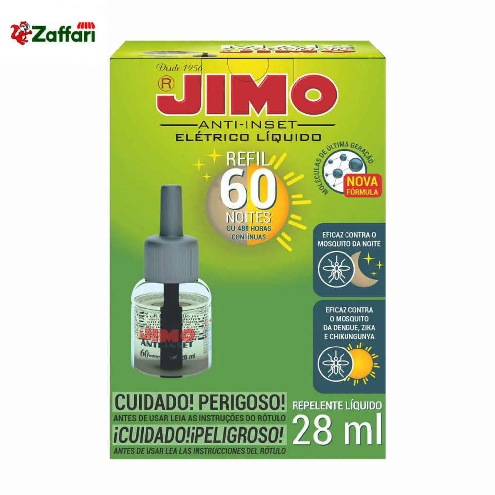 Multi-inseticida 60 Noites da marca Jimo em embalagem refil com 28 mililitros. Pode ser utilizado durante o dia e a noite. Leia as instruções do rótulo antes de utilizar o produto.