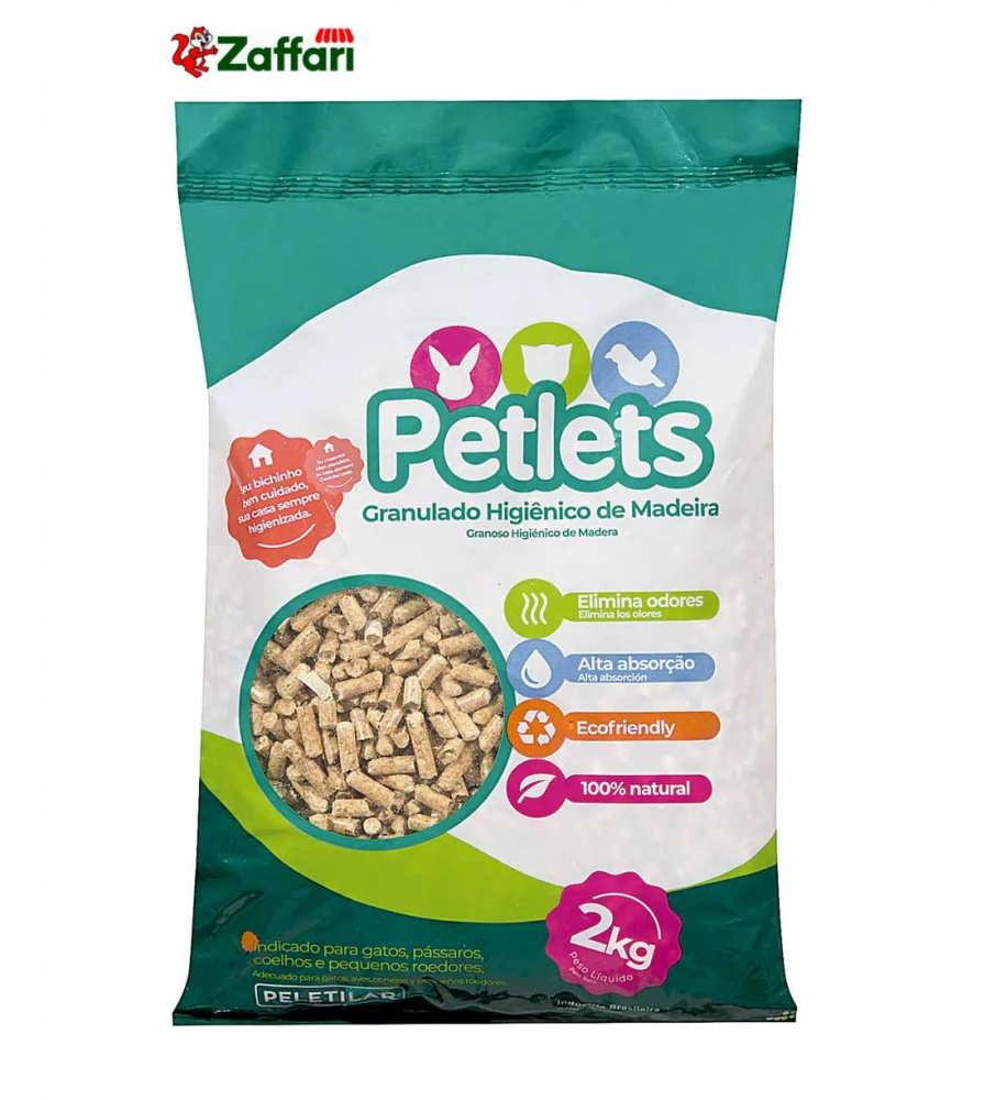 Granulado Higiênico de Madeira, da marca Petlets, em embalagem com 2 quilos.